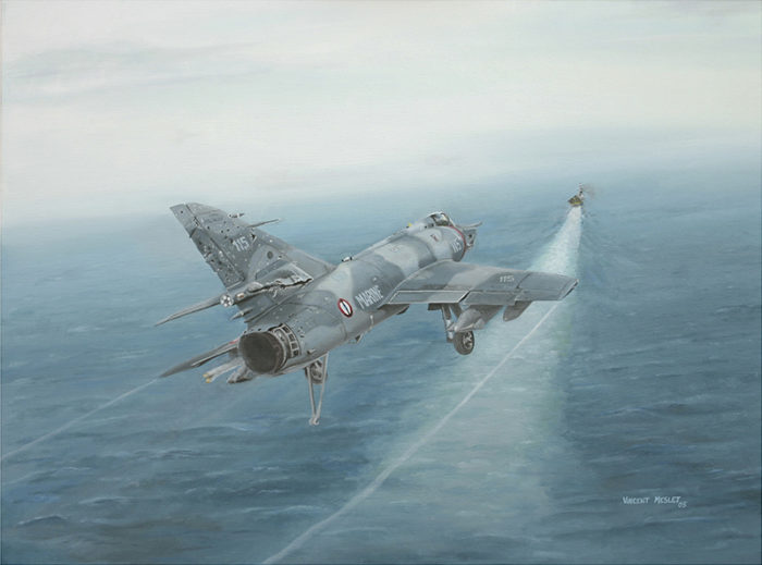 This painting represents the carrier landing aboard the Clemenceau of the Etendard IVP S/N 115 piloted by Pierre « FOSTER » Clary which has been hit by a SAM during a recce pass over Gorazde in Bosnia in April 94.