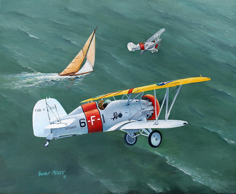 Des F-4B de l’US NAVY appurtenant à la VF6 basée à Moffett Field dans les années 30 rendent visite à un voiler de compétition « classe J ».