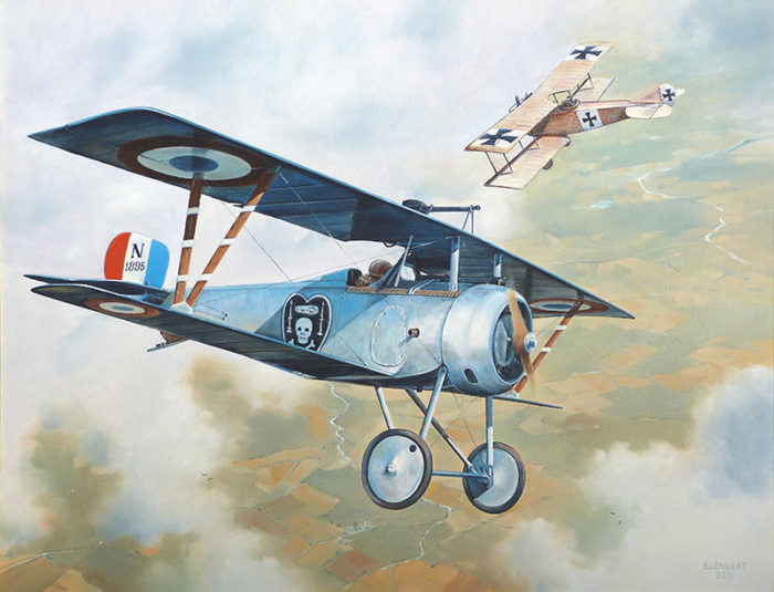 Charles Nungesser aux commandes de son Nieuport Ni17. Dans cette composition imaginaire, un appareil d’observation LVG tente de gagner la protection des nuages pour échapper au chasseur. Mais il sera probablement la prochaine victime de l’As (qui compte d’ailleurs plusieurs LVG à son palmarès), et qui terminera la guerre avec 43 victoires homologuées, palmarès faisant de lui le troisième As français après Georges Guynemer et René Fonck. C’est sur le fuselage de son Nieuport 17 que Nungesser fera peindre, pour la première fois, son célèbre et macabre emblème à la tête de mort, aux tibias croisés, avec cercueil et chandeliers dans un cœur noir. Cet insigne sera repris sur toutes les autres machines qu’il pilotera par la suite, comme le Spad XIII et même sur « l’oiseau blanc » (un Levasseur Pl 8), avion à bord duquel il disparaîtra avec son coéquipier et navigateur François Coli, lors d’une tentative de traversée de l’Atlantique de Paris à New-York le 8 mai 1927.