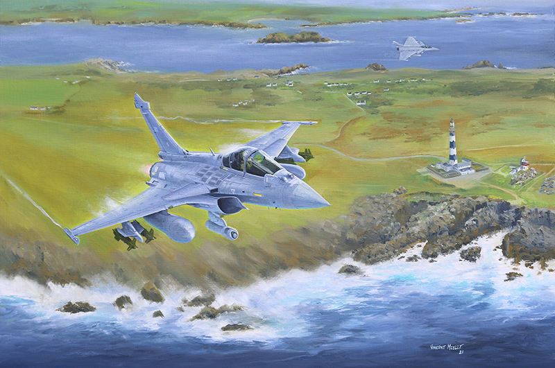Une paire de Rafale M de la 11F basée à Landivisiau, fait un passage bas au dessus du phare du Créac’h sur l’ile d’Ouessant. Penn Ar Bed en Breton signifie « bout du monde », un rappel de la situation géographique de cette ile.