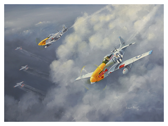 The main mustang, “Detroit Miss” is flown by the Lt Urban Drew. Autumn 1944.